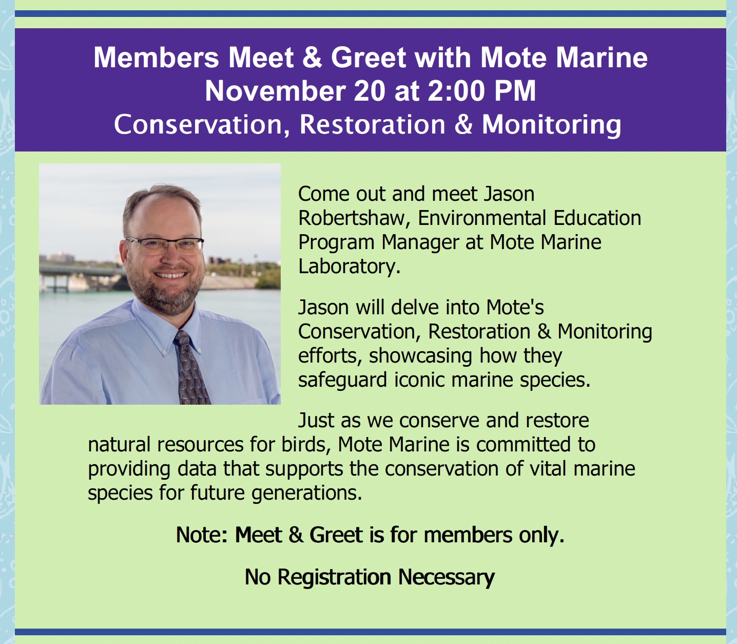 Members Meet and Greet – A way for our members to see each other face to face! Meet your board members and enjoy a short presentation by a local environmentalist. Light refreshments. November 20, January 15, March 19; 2-3:30 pm in the Nature Center. Today’s speaker is Jason Robertshaw, Environmental Education Program Manager at Mote Marine. Click here to read more.
